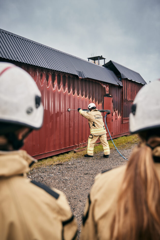• Elevene blir delt opp i grupper på brannfeltet og skal evaluere hverandre underveis på de ulike casene, samtidig som instruktørene har det overordnede blikket. Vi rullerer på rollene underveis, slik at alle får prøvd seg i de ulike rollene man finner på en brannbil.